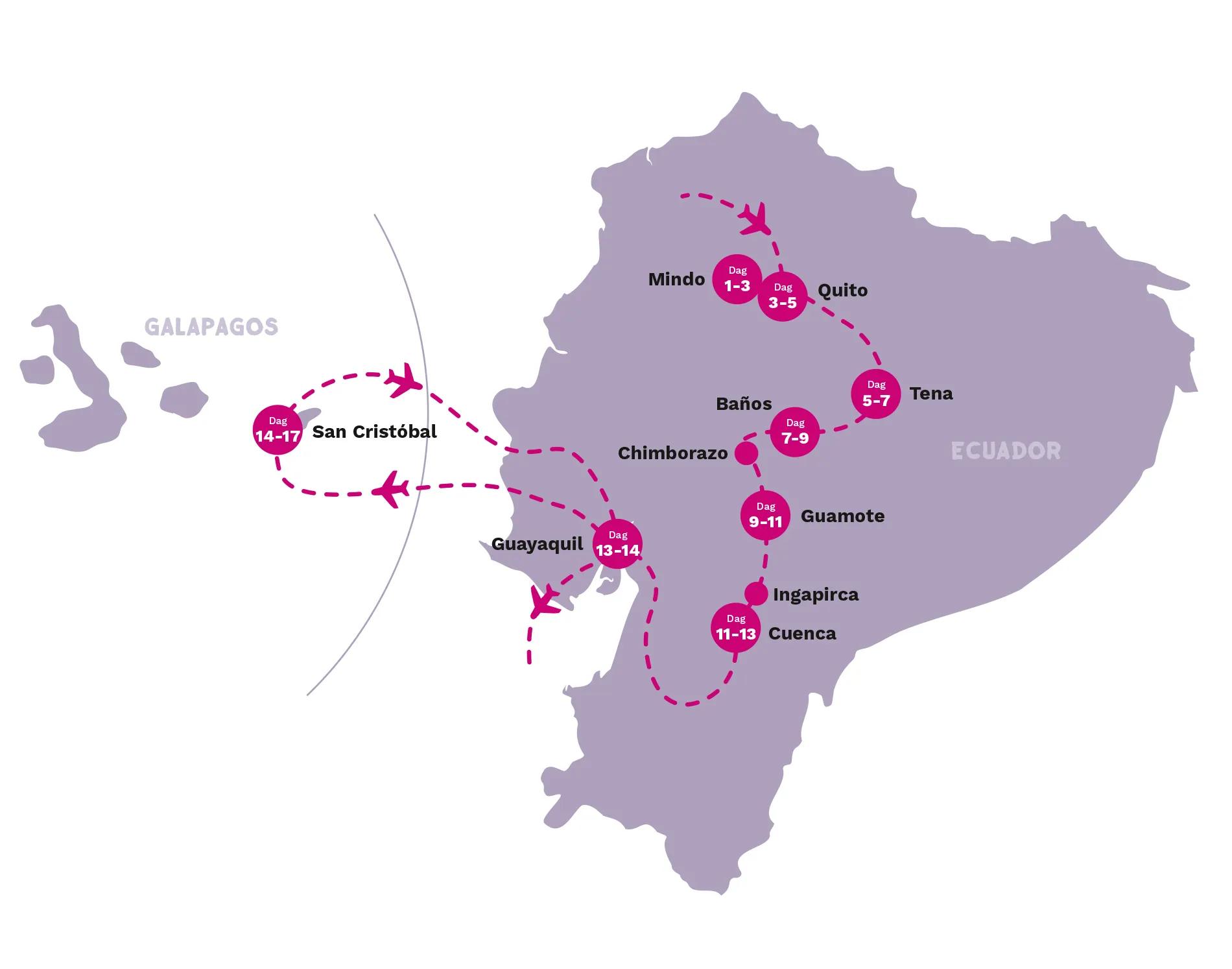 Dit reisprogramma is gebaseerd op de standaardreis. Mogelijke wijzigingen, verlengingen en extra opties worden hier niet weergegeven. In Ecuador kan het voorkomen dat de groep op sommige plaatsen over verschillende hotels verdeeld wordt, dit is een gevolg van de kleinschaligheid van veel hotels en onderdeel van de charme van het land!